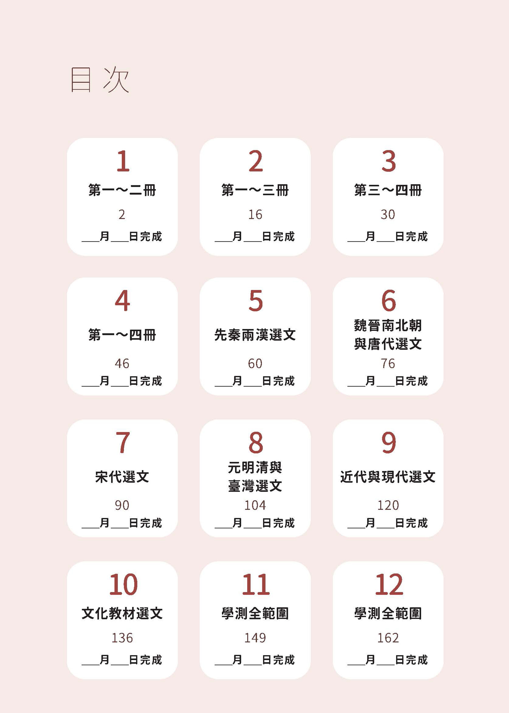 高三同學可以參考排定十二週的複習計畫,每回皆有針對大考題型精心編寫的解題技巧分析,協助同學應考達事半功倍之效。