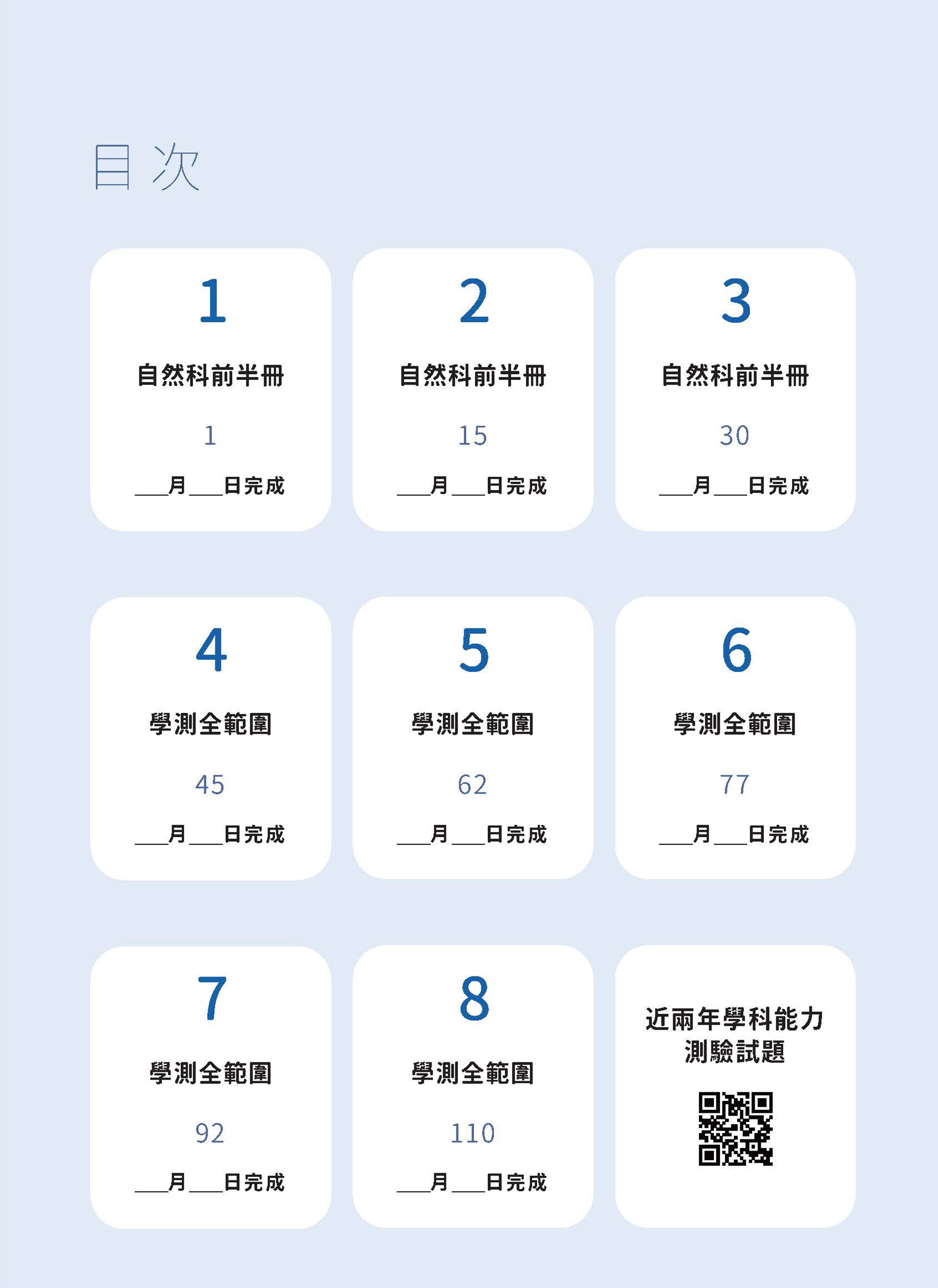 一、全書共8回、3回自然科前半冊、5回學測全範圍,由多位老師精心命製,幫助學生適應各類題型