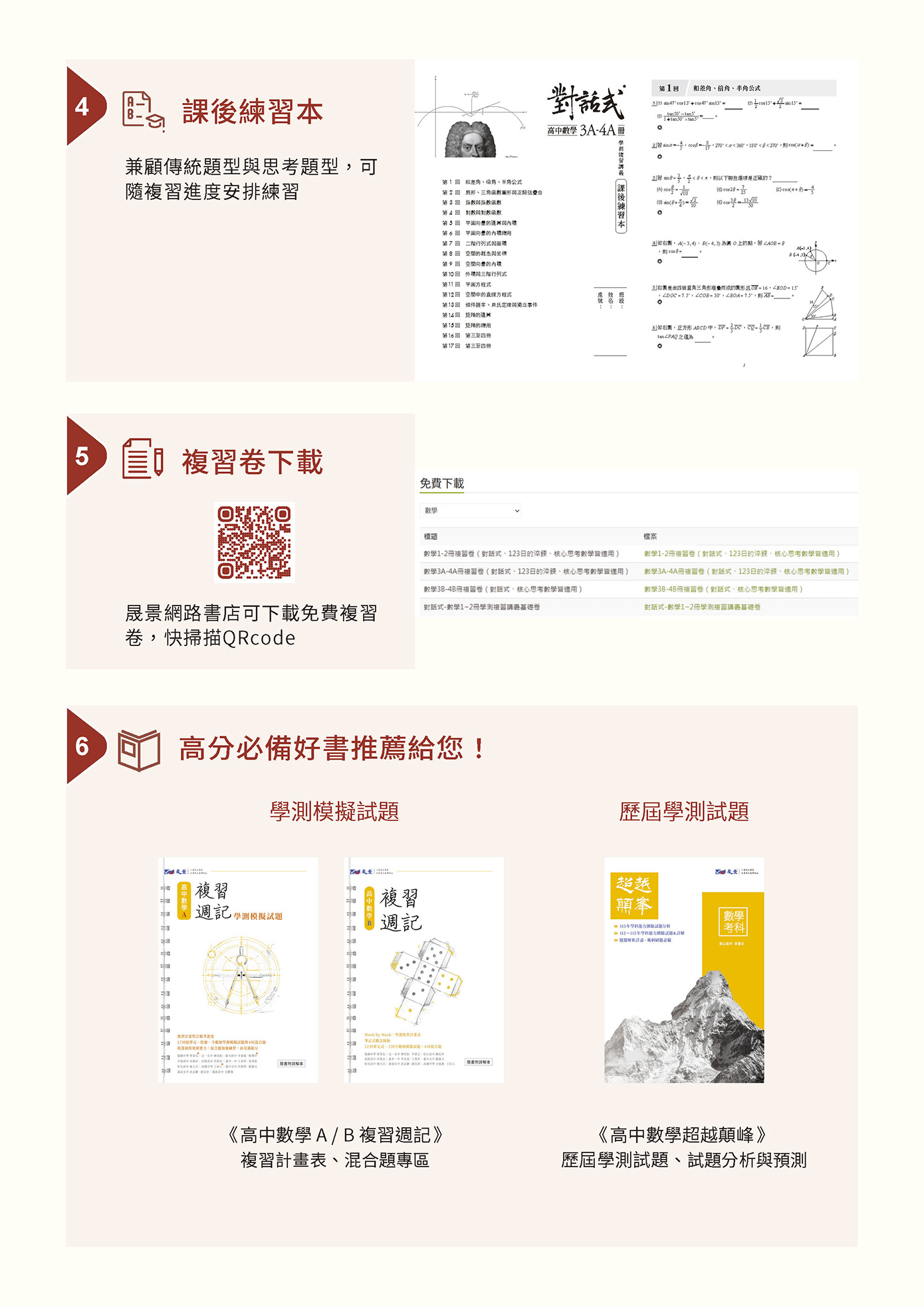一、依據108 課綱編寫,統整高中數學教材內容,含混合題、素養題,各式新課綱題型。