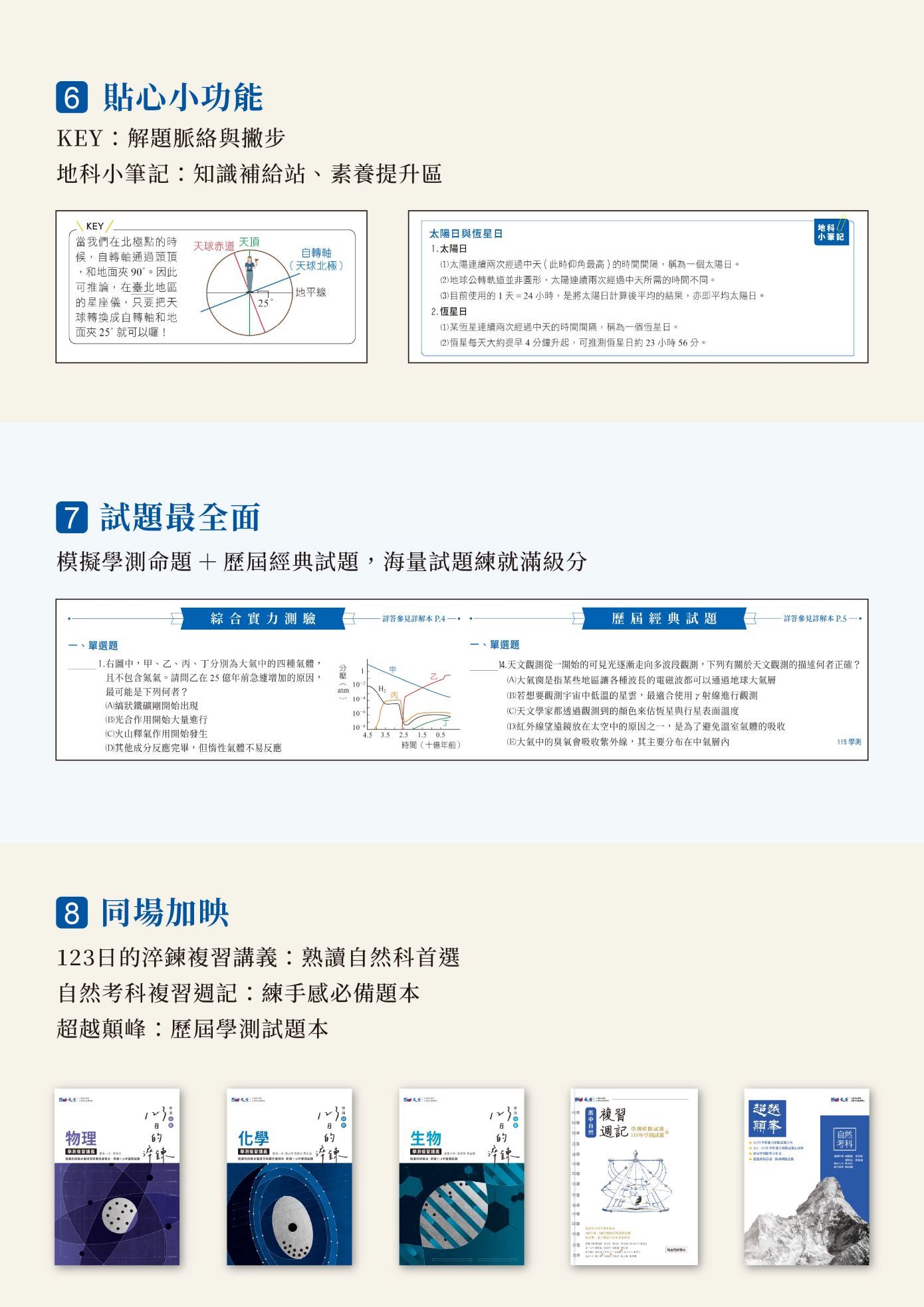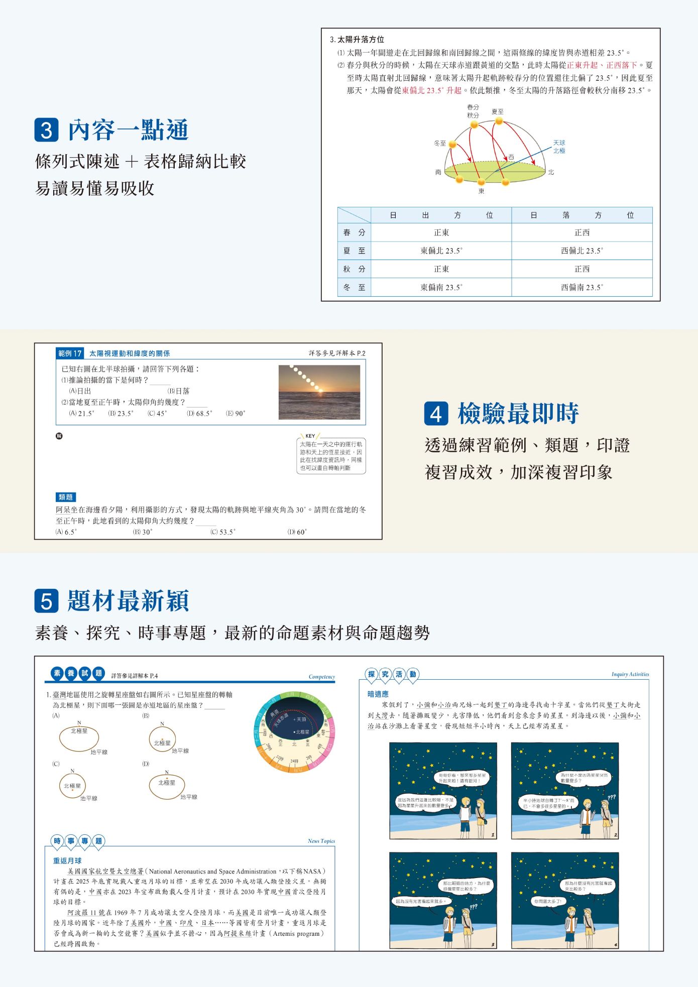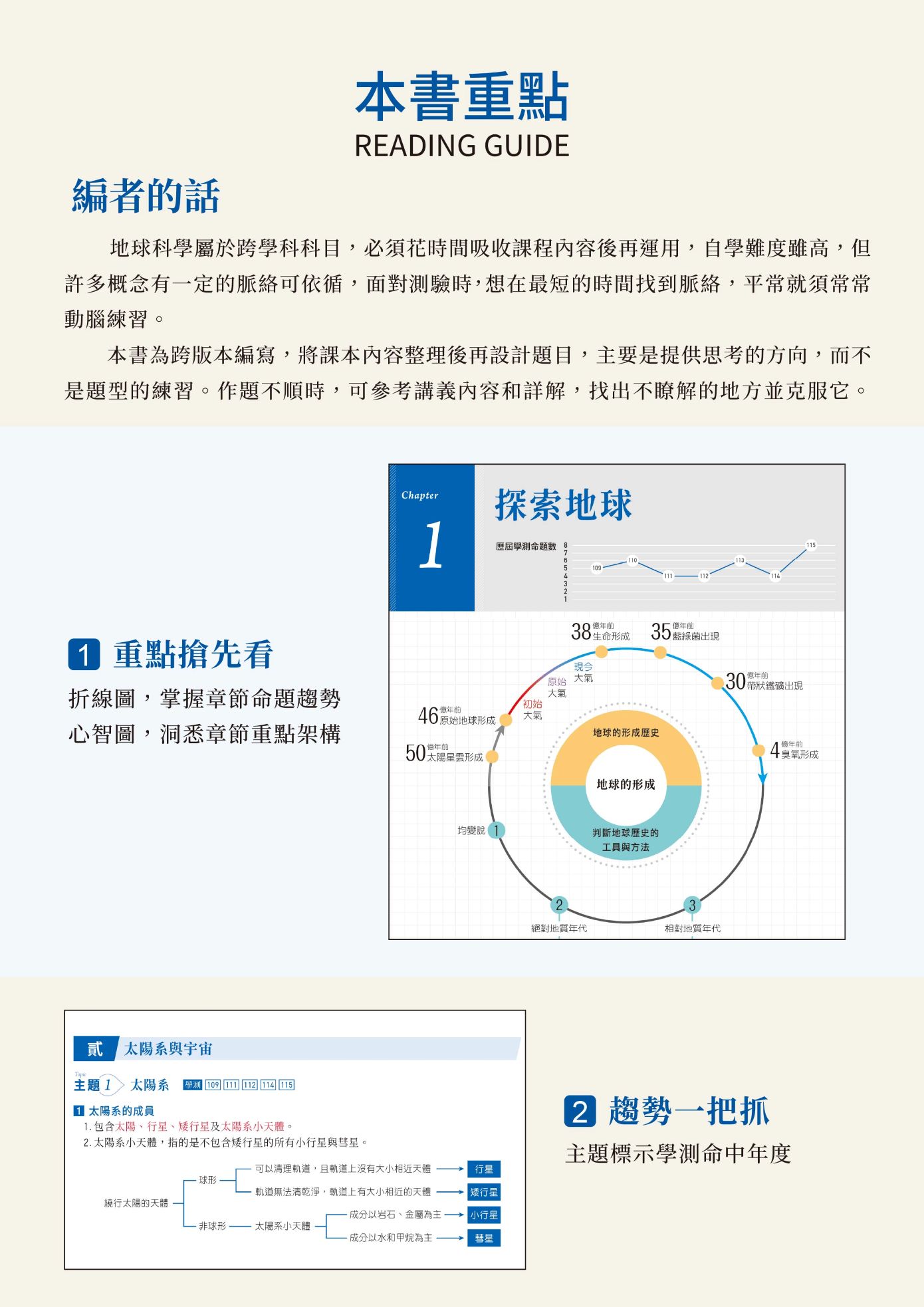 一、依據108 課綱編寫,統整高中地球科學教材內容,含混合題、素養題,探究與實作題,時事專題,各式新課綱題型。