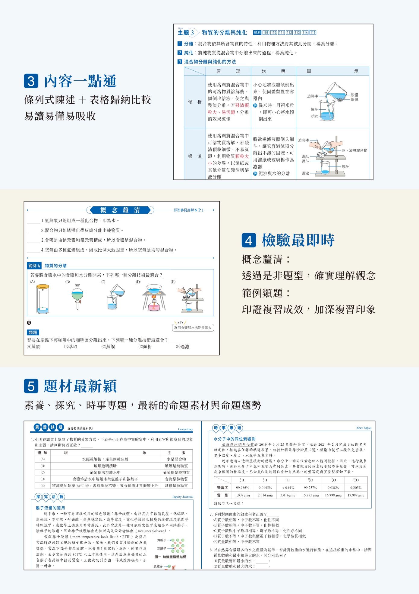 一、依據108 課綱編寫,統整高中化學教材內容,含混合題、素養題,時事專題,探究與實作題,各式新課綱題型。