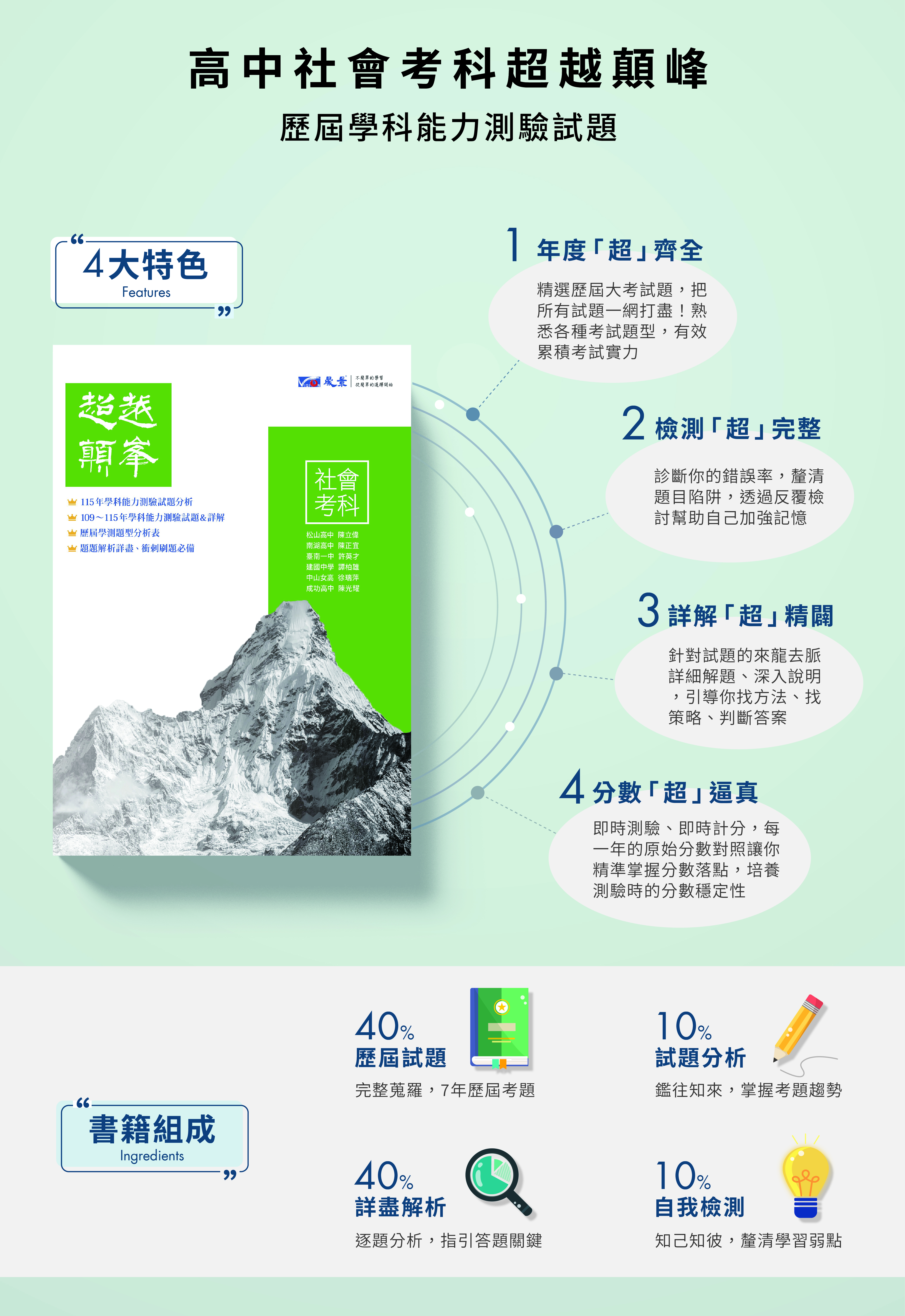 《高中社會考科超越顛峰-歷屆學科能力測驗試題》四大特色: