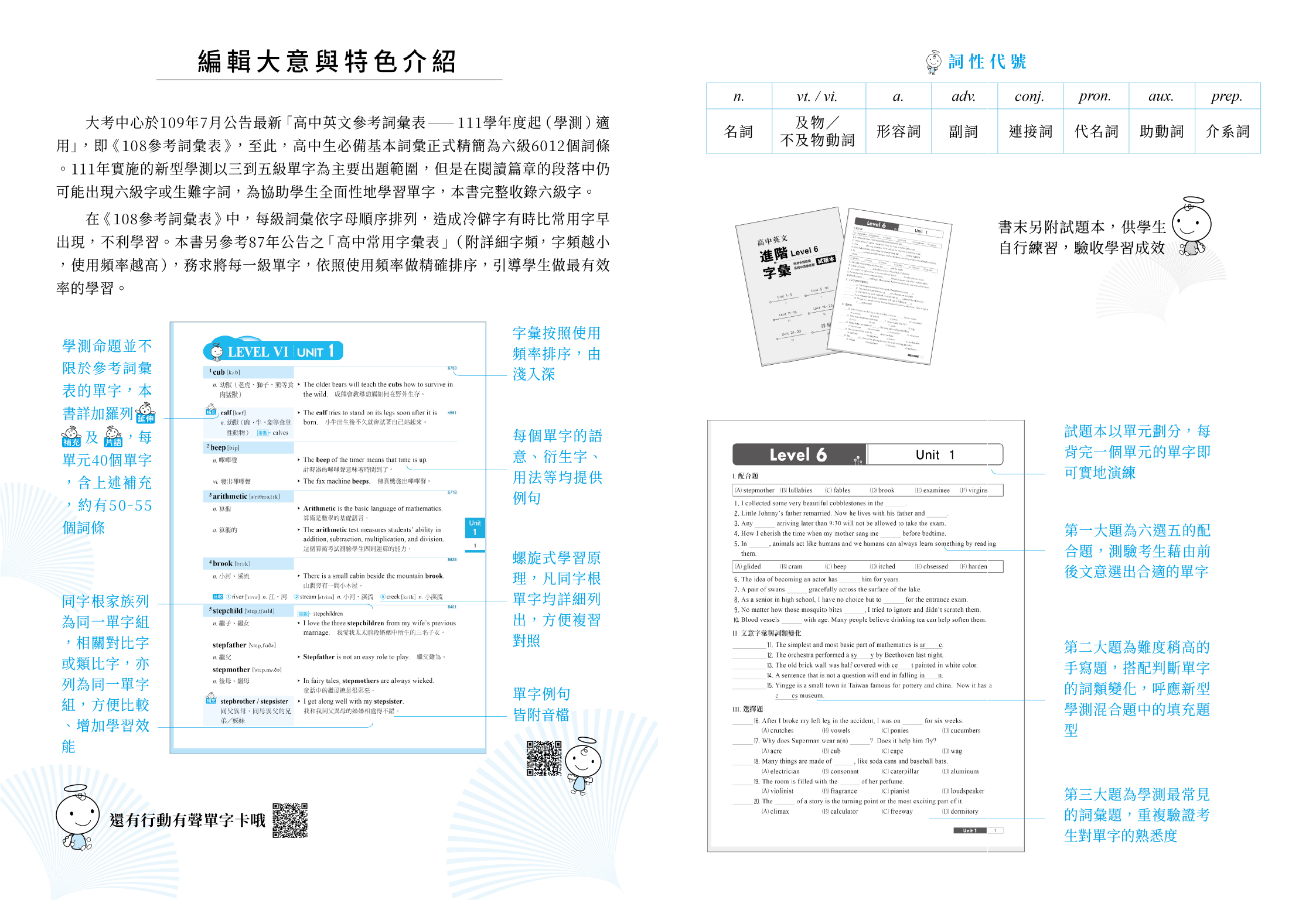但是在閱讀篇章的段落中仍可能出現六級字或生難字詞,為協助學生全面性地學習單字,本書完整收錄六級字。