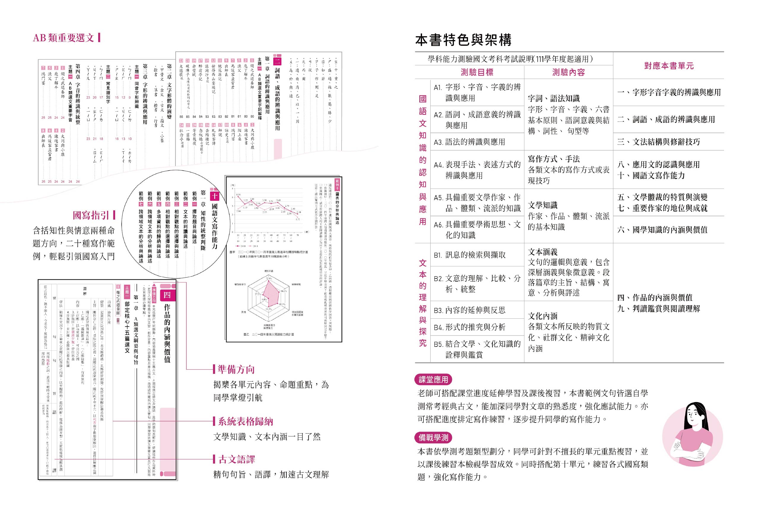 內容取材自108課綱部定15篇核心古文、AB類選文、《論語》與《孟子》,並配合大考中心公布的測驗目標,進行加廣加深的統整,與課堂上的學習相輔相成。