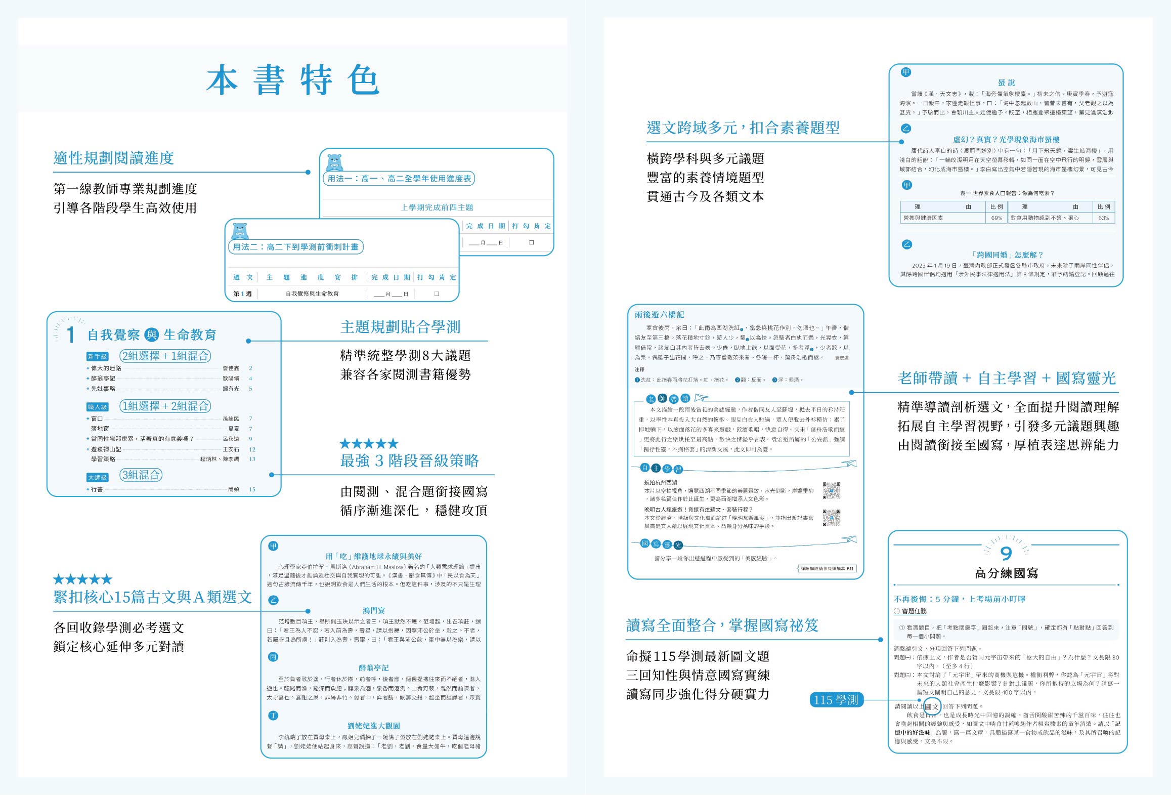 針對學測常考8大議題為主軸,規劃閱測、混合題及國寫實戰,打造由淺入深的閱讀進化路徑。