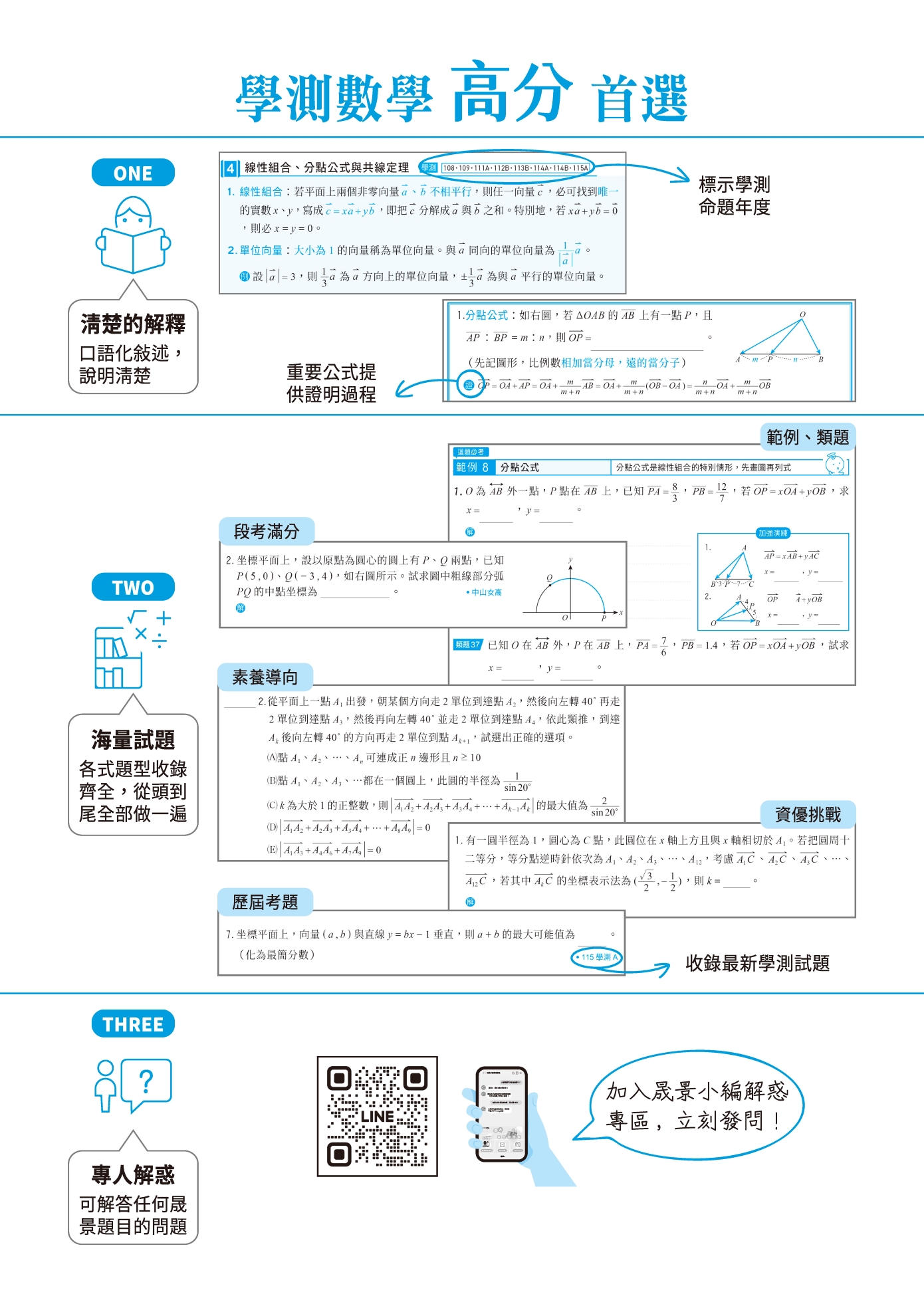 三、收錄段考滿分挑戰(各校段考題)、素養導向試題(素養題、情境題)、歷屆大考試題(學測題、指考題)與資優挑戰園地(挑戰程度)