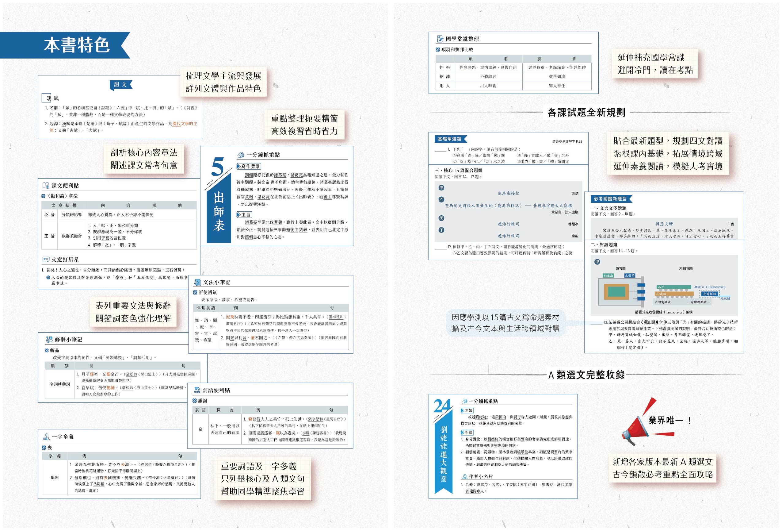 ✨【新增-A類別冊】歸納各版本選文,收錄市面最新、最完整「A類選文」,古今、文白、韻散、思想類兼顧,全文收錄,精闢整理關鍵考點,複習超高效率。