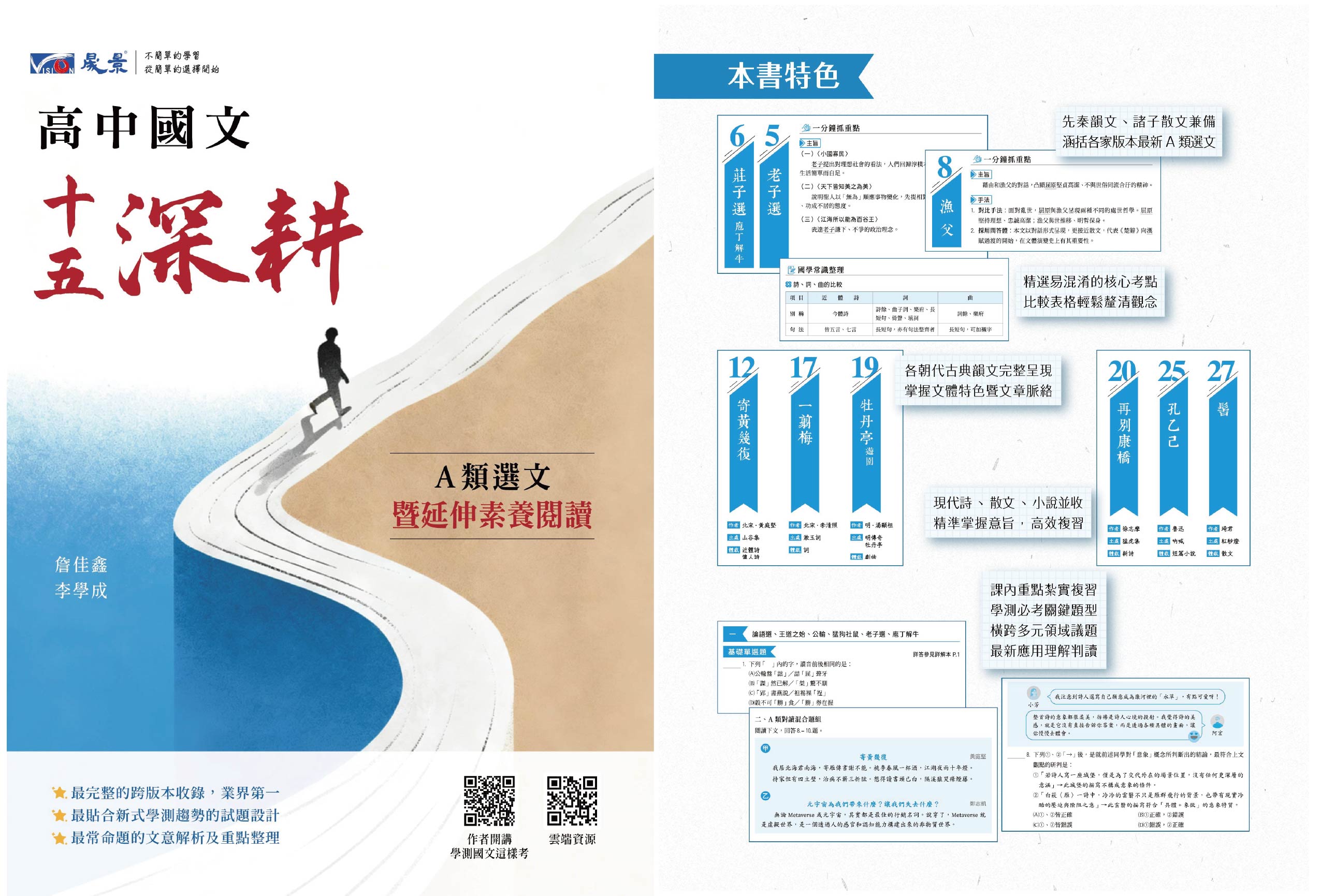 【核心/A類延伸素養閱讀】貼合學測最新命題趨勢,命製基礎單選題、文言文多選題、圖表文白對讀題組、15篇/A類對讀混合題組等題型,由核心15篇扎根、延伸,選文多元跨域,全面模擬大考實境。